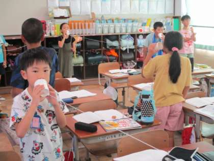 お互いにコップに向かって交互にしゃべりながら試していました。