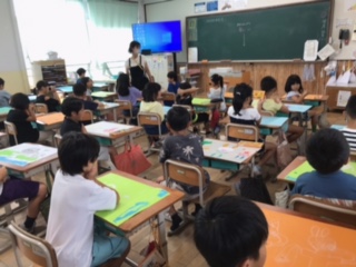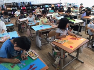 図画工作科で「お話の絵」に取り組んでいます。専科の先生のお話を聞いて、集中してクレパスで色を塗っていました。かわいい絵ができあがりそうで楽しみです。