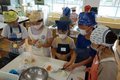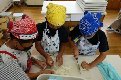 金曜日に行く野外活動に向けて、調理実習をしました。作ったのは野菜炒め。全員が包丁やピーラーを扱う経験をすることを目的に、グループで協力して調理をしました。
