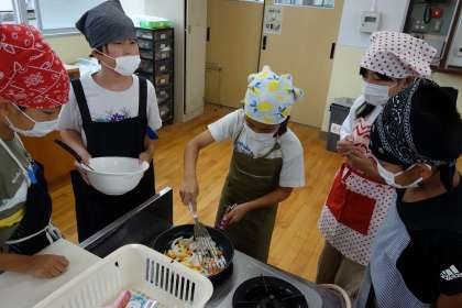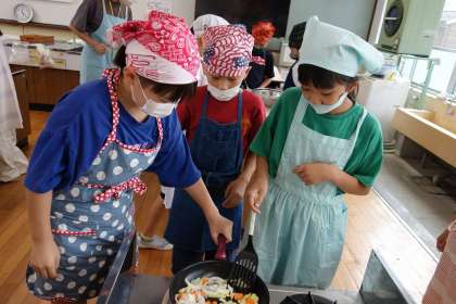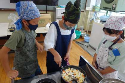 家庭で調理をした経験がある子どもたちがアドバイスをしながら、みんな慎重に作業を進めていました。「薄く切った方が炒めやすいんちゃう?」「待ってる間にお皿洗おう。」など、体験を通して大切なことにたくさん気づいていました。