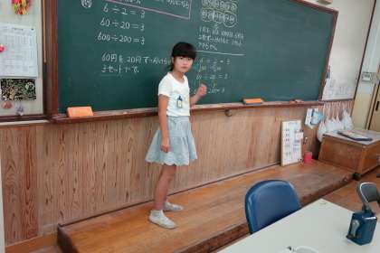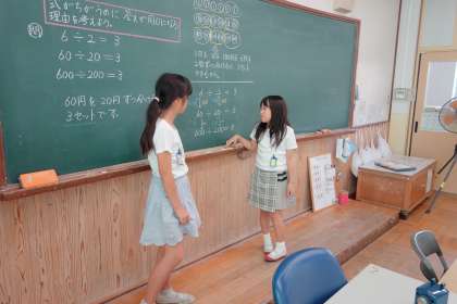 算数では、「式は違っても答えは同じ」になるわり算について学習しました。なぜ答えが同じになるのかを考え、黒板で説明しました。2人とも丁寧に説明することができました。
