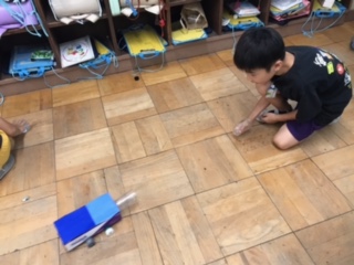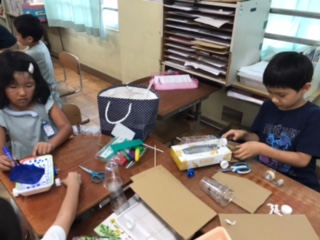 生活科の学習で動くおもちゃを作りました。ゴムやペットボトルのキャップを利用し、動くしくみを使ってそれぞれ工夫したおもちゃを作っていました。車に帆をつけてうちわであおいだり、車の後ろにカップで作ったゴムで跳ぶしくみをつけたり、おもりでゆらゆら動いたり、じしゃくではさんで動いたり、楽しいおもちゃができました。
