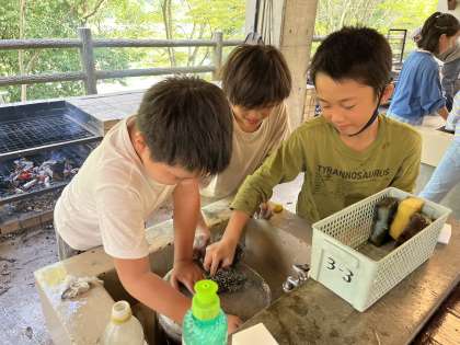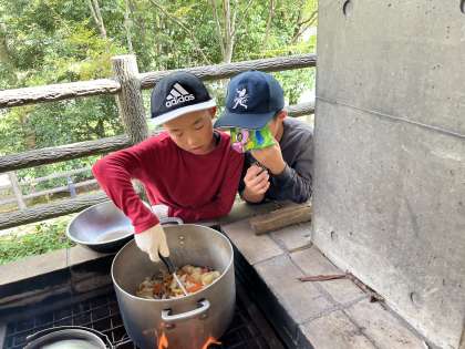 野外活動でカレーを作りました。野菜を切って、火をつけて、班でおいしく食べることができました。なかなか火がつかなかったり、お鍋についた真っ黒の炭を取ったりすることに苦労しましたが、最後まであきらめずにグループで声を掛けながら協力して取り組むことができました。