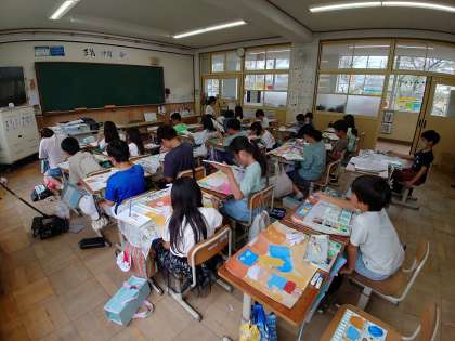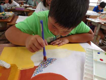 読聞かせで聞いたお話の様子を想像し、画用紙に表現する学習をしています。「クスクスムシシ」「ホンキ鳥」など、現実にはいない生き物を、自分なりにデザインして描いています。どんなお話の世界が描かれるでしょうか。