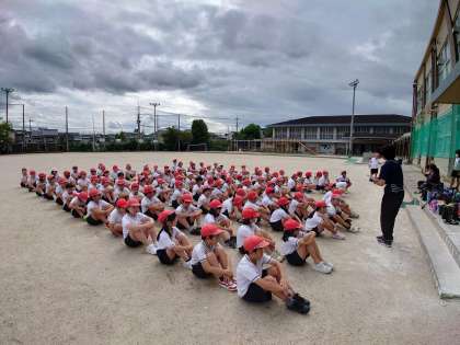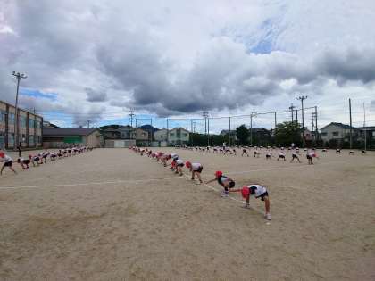 教室での振付けの練習を終え、いよいよ外での練習が始まっています。「ソーラン!ソーラン」の掛け声が空に抜けてしまうことに戸惑いながらも、一生懸命隊形移動を覚えています。まだまだ完成まで道のりは長いですが、やりがいをもって取り組んでほしいと思います。