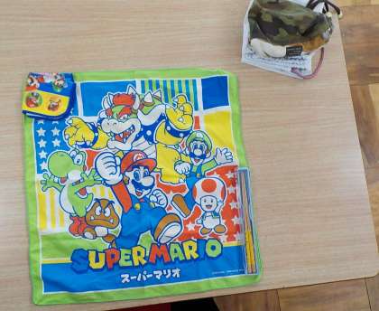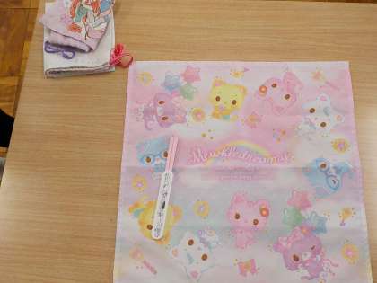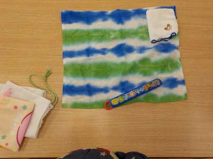 その前に、まずは食事をするための準備!机の上は、給食袋もエプロンの袋もきれいに畳んで準備万端です。