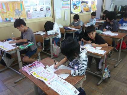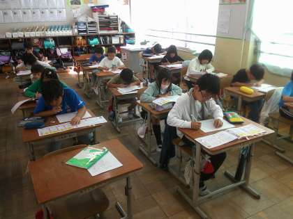 鉛筆の音がコツコツコツと鳴り響き、「○○は、縦線が△本で・・」とつぶやく児童の声。