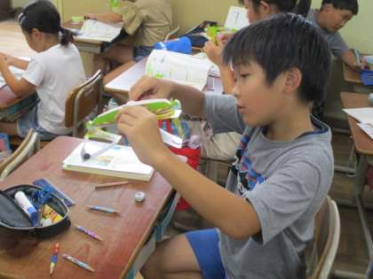 身の回りのものの重さを、手作りの天秤を使って比べました。