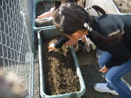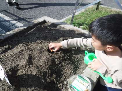 小松菜は小さくて細かな種。玉ねぎは、球根です。どんな芽が出てくるのか楽しみです。玉ねぎの収穫は、春ごろ、小松菜は冬野菜です。大きく育つように毎日水やりをしています。