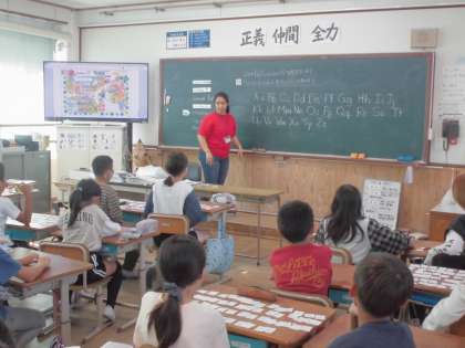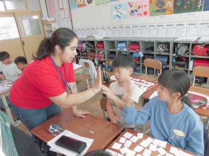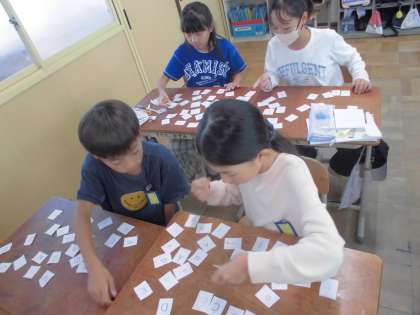 ALTの先生と一緒にアルファベットの学習をしました。小文字のアルファベットに慣れ親しむために、大文字と小文字のアルファベットを合わせるカードゲームを行いました。ハイタッチをしながら楽しく活動し、楽しく学ぶことができました。