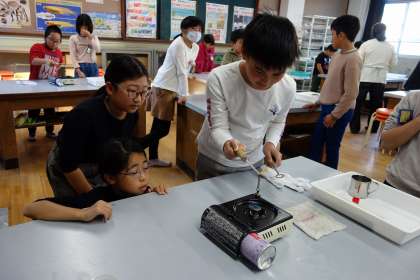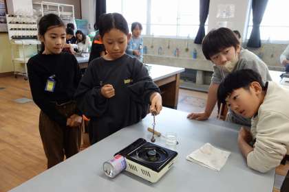 バーナーで熱せられた鉄球は、鉄の輪の中を通りませんでした。子どもたちは実験を通して、鉄は熱すると体積が増えることを学びました。驚きを伴いながら学べることが理科の醍醐味ですね。