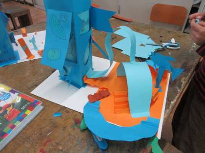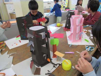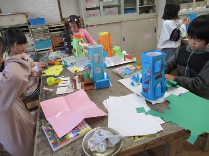 「まどをひらいて」もうすぐ完成です。カッターナイフの使い方も上手になりました。お化け屋敷やペットショップなど色々あって楽しいですね。