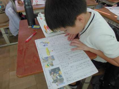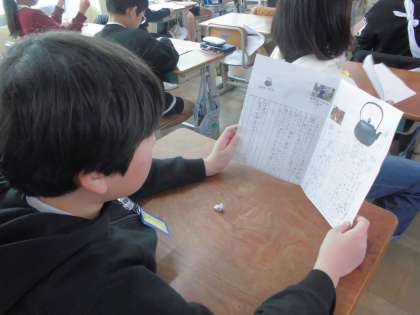 国語科で作成したリーフレットを読み合いました。自分たちが選んだ伝統工芸の魅力や特徴をリーフレットに書きました。「こんな伝統工芸品があるんだ!」「これは見たことがあるな!」「丁寧な文字で書かれていて読みやすいな」など色々な感想を持つことができました。
