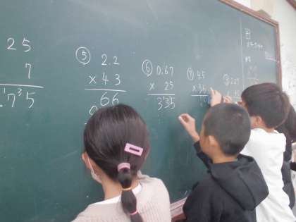 算数では小数のかけ算を学習しています。自分からすすんでかけ算の問題に取り組み、その答えもすすんで子どもたちは黒板に書きに来てくれます。小数のわり算もこの調子で学んでいけたらなと思います。