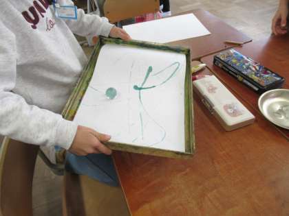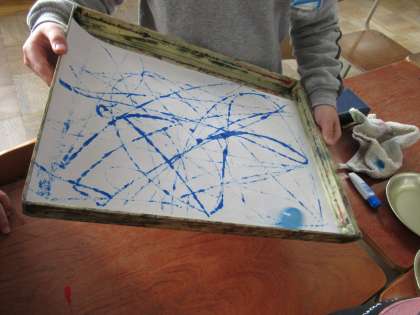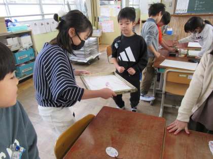 紙版画のはいけいづくりをしました。ビー玉に絵の具をつけて、紙の上をころころと転がしていきました。この背景に、自分たちが作った紙版を刷っていきます。どんな作品に仕上がるか楽しみですね。