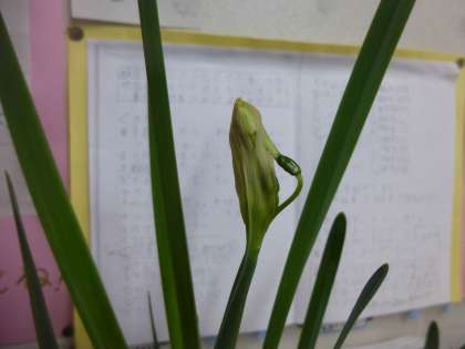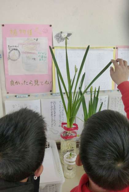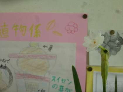 教室で育てている水仙の花が咲きました!つぼみを見つけると、「いつ咲くのかな〜」と休み時間にじーっと観察し、「今ちょっと動いた!!」と教えてくれる子もいて微笑ましかったです。今後も植物を育てながら皆で観察を続けていきたいと思います。