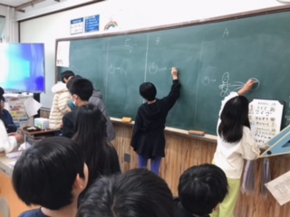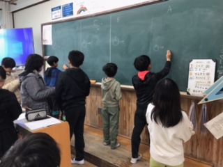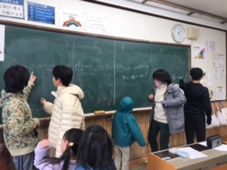 ひさしぶりにたてわりグループ遊びがありました。昼休みは、外は少し雪が降っていましたが、教室や体育館に分かれて楽しく遊んでいました。2年4組の教室では、絵で描くしりとりをしていました。
