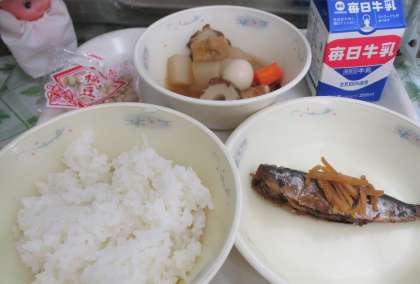 ごはん 牛乳 いわしのしょうが煮 関東煮 いり豆 でした。