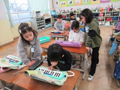 音楽の学習で「はるがきた」の曲をけんばんハーモニカで練習しています。今日は、ペアで聞きあい、苦手なところを教えてもらったりアドバイスをしたりして学習でを進めました。とても微笑ましかったです。