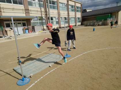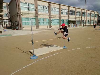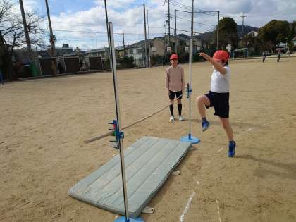 体育では「走り高とび」の学習が始まりました。助走の距離やバーへの入射角、軸足の位置、ひざを伸ばすことなど、たくさん気を付けることがあります。子どもたちは、まず一つ気を付けることを決めて練習をしていました。