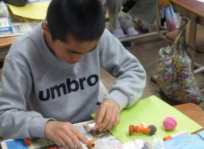 紙粘土を使って、昔話の一場面を作っています。「ここに木を作って…」「こうしたらどうなるかな」と試行錯誤しながら取り組んでいます。どんな昔話の世界が出来上がるのか、今後も見守っていきたいと思います。