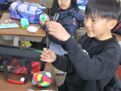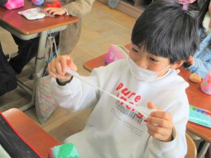 紙粘土に絵の具を練りこんで色をつける、という体験が初めての子どもたちは、伸びる紙粘土や色が変わっていく様子に