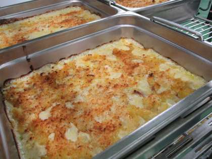 ペンネの豆乳グラタンは、クラスごとに分けたクリーム煮にパン粉をふりかけて