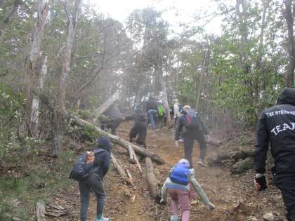 4年生以上は子どものみの参加もOK、3年生以下は保護者同伴での参加で約80名が参加しました。おやじの会の方を先頭に舟山の頂上を目指して登ります。