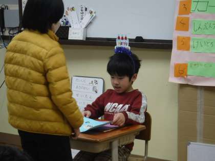 プレゼントのカード渡しや「けいどろ」遊びをしました。ハッピーバースデーも歌いました。