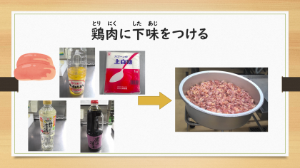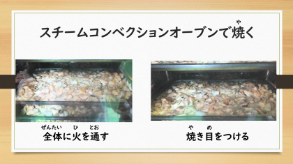 今日の給食の鶏肉のてり焼きは鶏肉に下味をつけた後、片栗粉と玉ねぎを混ぜ合わせてスチームコンベクションオーブンで焼きました。