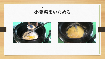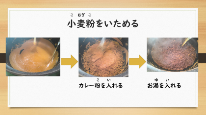 手作りのカレールーはバターとサラダ油、小麦粉を1時間ほど焦がさないように炒めて、そこにカレー粉や溶かした脱脂粉乳を加えて作っています。