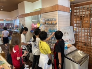 クラスごとに入浴とお土産選びの時間です。温泉は、とても気持ちいいそうです。お土産は、自分のものかな?家族へかな?、限られた金額なので悩んでいます。
