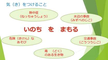 そして、命を守るには、熱中症や交通事故や水の事故に気をつけることも大切です。他にも危険な遊びをしないことも大切です。特に火を使う遊びは絶対ダメです。自由研究や料理などでに火・ガス・電気を使う場合、大人の人の許可を得てください。他にも山や草むらでは毒のある虫や植物に出会うことがあります。十分気をつけてください。とたくさん注意することを話しました。