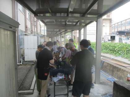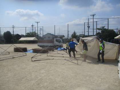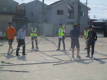 朝から地域の皆さんが本日17時からの夏祭りに向けて準備をされています。テントを立てたり、電気の配線をしたり、各コーナーの準備をしたりと暑い中、水分補給や休憩を随時取りながら進めています。