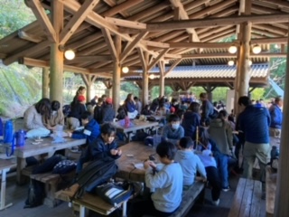 荷物整理を終え、山の家の先生に教えてもらって火おこしに挑戦。着いた火は、この後の野外炊事に使います。