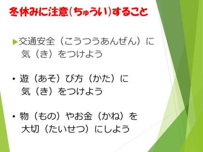 そして、冬休みを迎えるにあたり、「交通事故に気をつけること」「遊びのマナーやルールのこと」「お金や物の貸し借りはしないこと」を話しました。