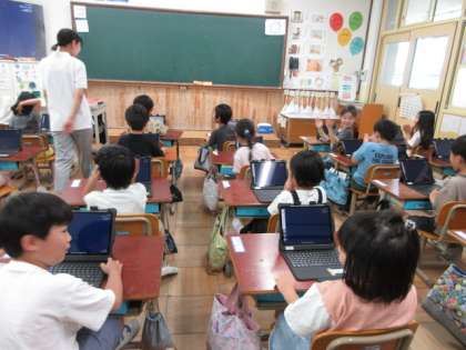 初めて端末を使います。ICT支援員さんにっもご協力いただき、電源を入れたり、ロイロノートを開いたりしました。