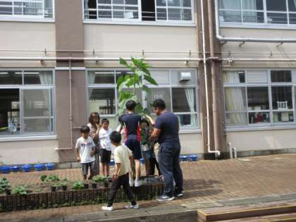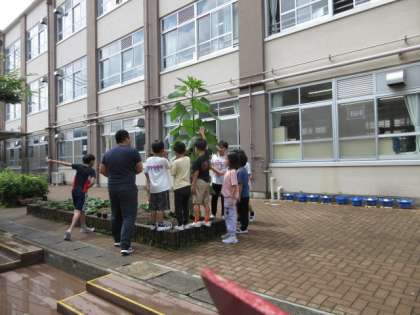 みんなで、てざわりや匂い、背の高さなどを調べ、大きなひまわりをじっくり観察しました。