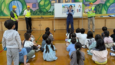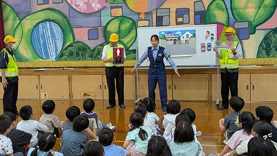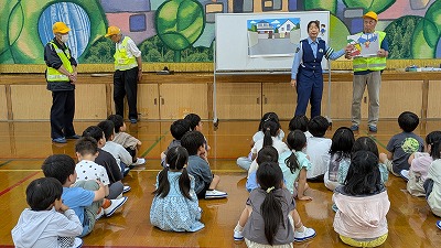 交通安全教室を行いました。北警察署の方に来ていただき、地域の方にも協力していただきました。横断歩道の渡り方や道の歩き方、車に気を付けるポイントなどを教えてもらいました。