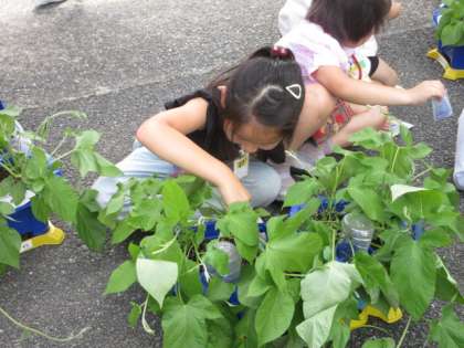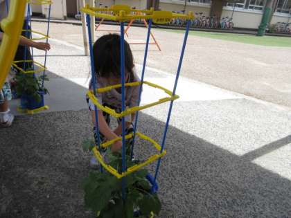 アサガオがとても大きくなりました。子どもたちの背丈ほど伸びているものもあります。そこで、一人一人が支柱を立てました。アサガオと背比べをして「こんなに大きい!」と喜ぶ声が聞こえました。