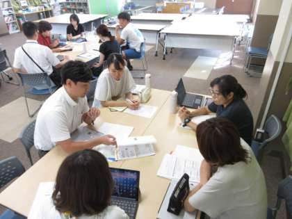 授業について、どのよう授業を行うのか、授業を行う単元をどのようにつくっていくのか、話し合い、考え、教育委員会の指導主事の先生にアドバイスをもらいました。