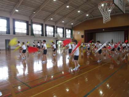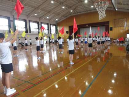 スポーツフェスティバルに向けて、フラッグの練習が進んでいます。フラッグが降られてパシッと響く音が爽快です。