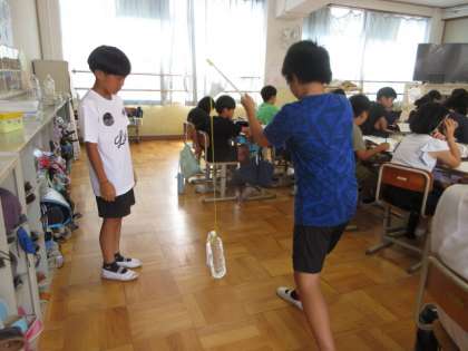 カツオ1匹のおよその重さと同じ重さのペットボトルを持ち上げて、一本釣りについて考える場もあり、子どもたちが順番にひもでつるされたペットボトルを持ち上げ、一本釣りの漁業について話し合っていました。