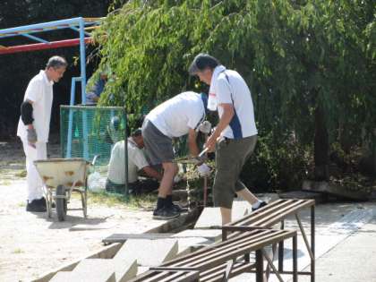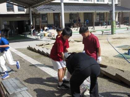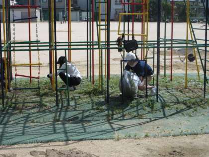 体育館の中では、倉庫の中も掃除してくださいました。総合遊具の下の雑草もぬいてくださいました。学校中の雑草が元気よく伸びていましたが、雑草の処理をしてくださいました。