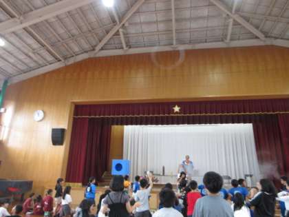 空気砲もでました。高学年も盛り上がりました。拍手をいっぱいしてくれました。低・中・高学年のたくさんの子どもたちが参加したサイエンスショーでした。