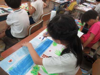 お話しの絵を描きました。一人一人のおもいが表れた絵が出来上がっていきます。集中してがんばりました。