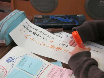 模造紙にまとめたものを見ながら班ごとに上手くいったエコを「おすすめカード」,これから頑張りたいことを「チャレンジカード」に書き,クラス全体に発表をしました。