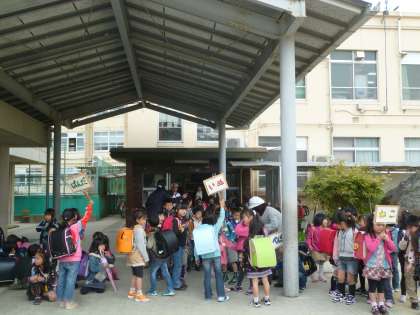 1年生は集団下校をしています。パンダ、いぬ、コアラ・・・と6つのグループに分かれて下校します。