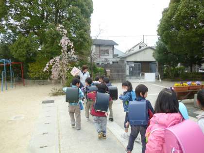 みんなで安全を確かめ、登下校の道を覚えながら先生たちと帰ります。
