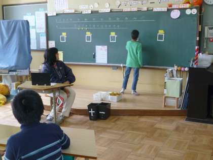 そらいろ学級では、算数の学習。先生が、机にサイコロ状の数ブロックを積んでいきます。でも、衝立があって、いくつ積まれたのかは計算しないとわかりません。「8個積んだはずだから・・・」「わかった、17個だ」正解すると、ピンポーンとチャイムが鳴ります。数直線上に数を置いていき、確かめていきました。みんな、正解することができて笑顔になりました。だんだん難しくなるけど、じっくり考えて解いていこうね。